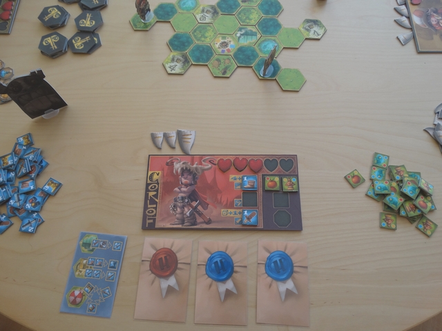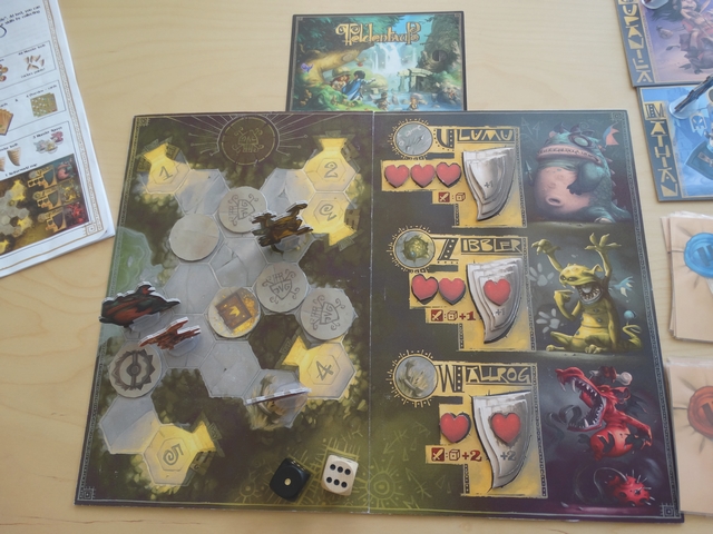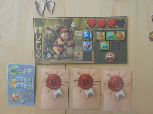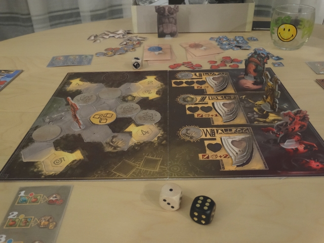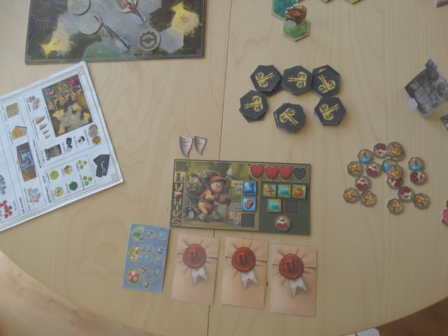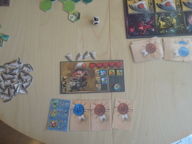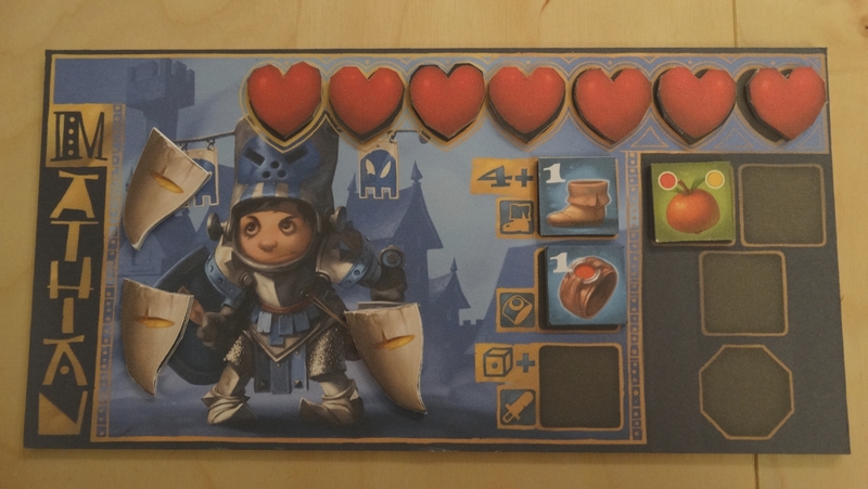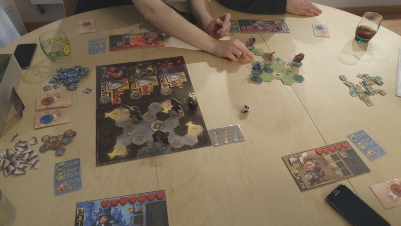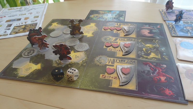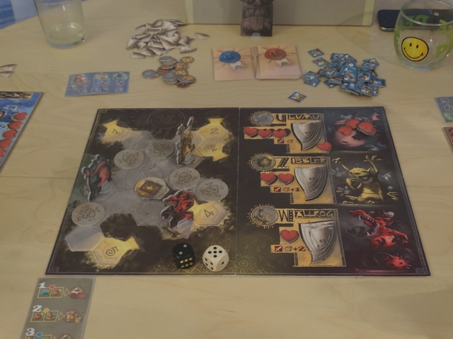 Les parties que j’ai pu effectuées sur ce prototype ont été de bonnes surprises : le jeu est très agréable et très fluide. On y retrouve les sensations de jeux vidéo RPG « old-school » (remplir des missions, améliorer son équipement, combattre) et le tout est très bien adapter à un jeu de plateau.