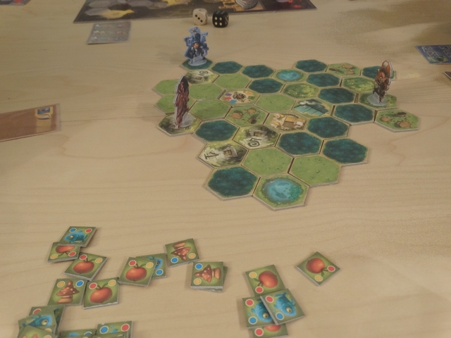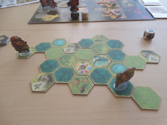 - Les tuiles « Forêt » : si vous en êtes le premier explorateur, vous vous perdez (et tous vos points d’actions avec), en compensation vous gagner un trésor (équipement ou dent de monstre – défini par un lancé de dé) ;
