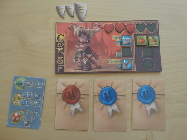 Chaque joueur dispose également de 3 cartes missions renouvelables – vous pourrez remplir ces missions pour gagner des équipements ou des dents de monstre (les points de victoire).