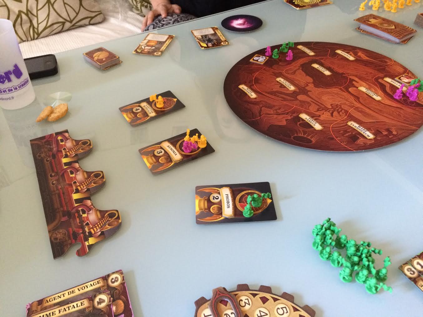 Le premier jeu dont on va parler n’est pas une nouveauté, et non, c’est une réédition.  Mission: Planète rouge a encore une belle carrière devant lui, puisque en plus d’avoir de nouvelles illustrations, on a droit à quelques points de règles améliorés (je vous invite à regarder les tric trac TV pour en connaitre  tous les détails). Ce jeu fait encore parler de lui et pour moi (je parle en mon nom personnel de GeekLette) c’est presque un Abyss dans le plaisir de jouer. Je dis bien presque, puisqu’Abyss n’a aucun égal, évidemment. Bref, pour en revenir à nos moutons, ou plutôt nos fusées, Mission: Planète rouge possède la même mécanique que Citadelles  à savoir que vous jouez les personnages de votre main et que l’un d’entre eux vous permet de récupérer ceux déjà joués. Bon nombre de sites vous expliquent déjà la mécanique complète donc on ne va pas revenir dessus. Mission: Planete rouge est à première vue un jeu magnifique (le plateau de Mars et les rampes de lancement sous forme de puzzle, les petits astronautes en figurine, les illustrations franchement pas dégueu) bref que du bonheur. Mais ce qui fait qu’on y revient très souvent, c’est sa facilité de règle et sa profondeur. A chaque partie, les objectifs diffèrent et l’on trouve un malin plaisir à détruire les fusées des autres, assassiner leurs astronautes ou encore changer la destination vers laquelle ils souhaitaient trouver de l’or. C’est du pur bonheur. Il se joue très bien de 3 à 6 d’ailleurs (on n’a pas testé les autres configurations). C’est assez rare pour le souligner. Le chaos règne cependant, faut accepter de couiner et en redemander 🙂