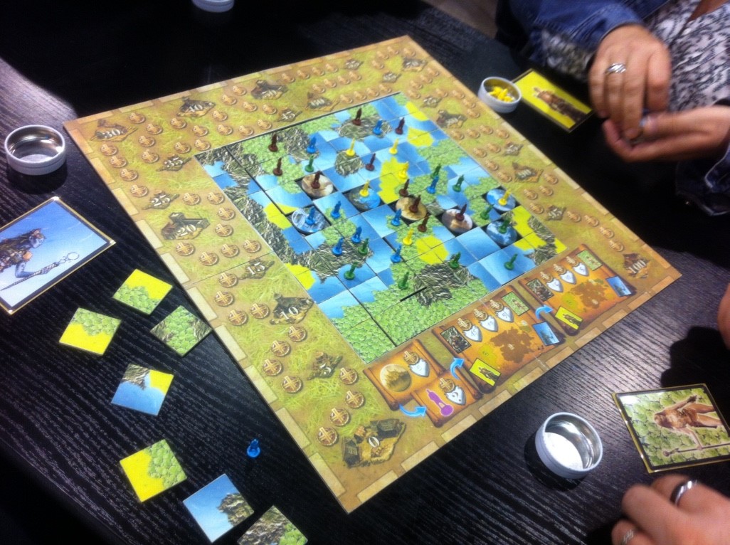 4 gods (2 à 4 joueurs) joué lors de l’Asmoday il y a un an déjà, j’attendais avec impatience sa sortie. Tous les joueurs jouent simultanément à construire une carte d’un monde à l’aide de tuiles « à la Carcassonne ». Mais attention à ne pas confondre vitesse et précipitation car 4 dieux vont pouvoir régner sur ce monde et tant que nous ne les aurons pas « recrutés » il est impossible de savoir si le territoire que l’on a construit nous profitera ou sera la propriété d’un autre. Alors, prendre un Dieu très tôt au risque de voir les adversaires bloquer le développement des territoires qui lui sont favorables ou trop tarder et devoir se contenter d’un choix par défaut ? Selon les experts ce jeu est un « city building évolutif en temps réel »… Parties courtes (20mn en moyenne), nerveuses… addictives (photo du prototype – sept. 2015 – fin de partie)