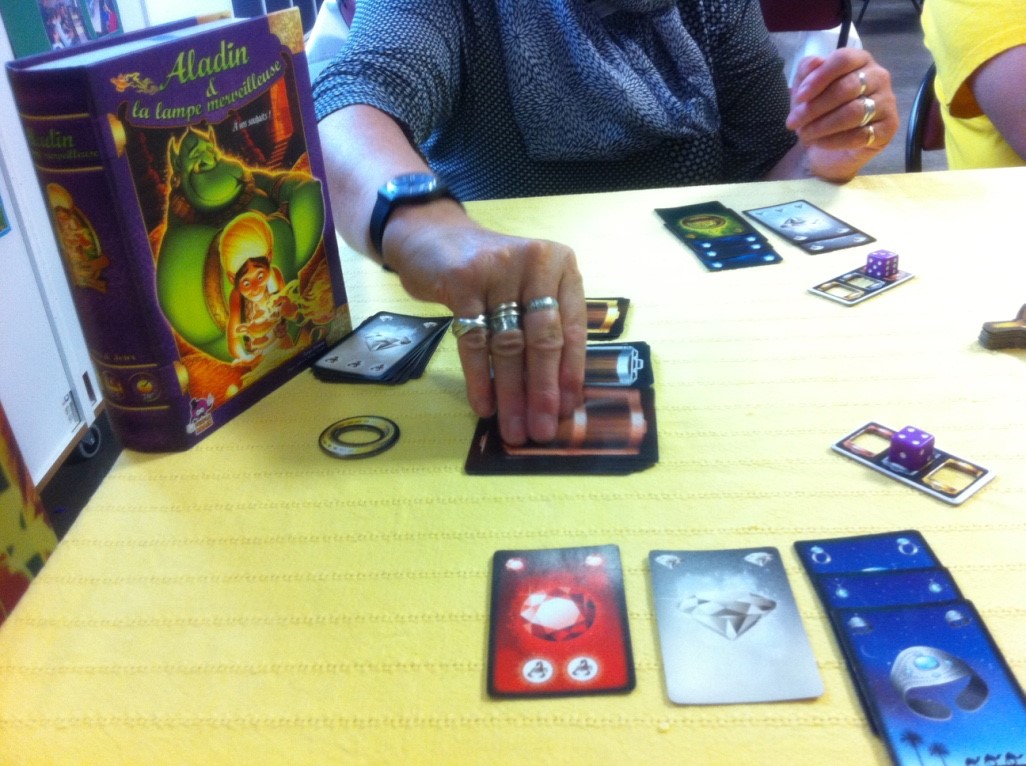 Aladin et la lampe merveilleuse (2 à 5 joueurs). Les joueurs veulent puiser dans l’un des trois coffres au trésor. Grace à un dé, chacun va secrètement choisir le coffre qu’il souhaite fouiller et combien de carte il souhaite y puiser. Dans chaque coffre seul un joueur puisera. Au cas où plusieurs aient choisit le même coffre seul le moins gourmand pourra piocher jusqu’à autant de cartes que le chiffre inscrit sur son dé, mais attention aux scorpions qui pourraient faire perdre l’ensemble de la collecte… En cas d’égalité de valeur un peu de rapidité permettra d’activer la lampe d’Aladin et d’obtenir un « pouvoir »… un sympathique mélange de bluff, guessing, stop ou encore et rapidité. Le jeu est léger et l’on est tenté d’une nouvelle partie « parce que l’on sera certainement plus malin la prochaine fois… »