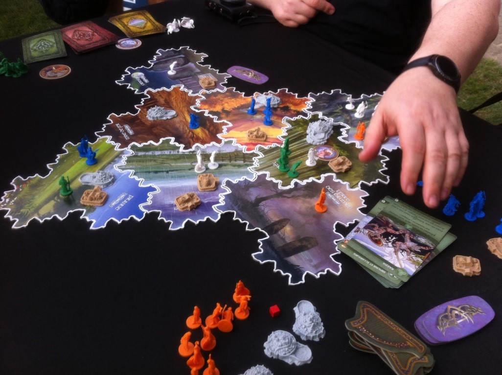 Inis (2 à 4 joueurs) est LE gros jeu que j’attends depuis ma partie à Cannes. Dans un univers celte très bien servi par l’univers graphique de Jim Fitzpatrick (un choix risqué mais gagnant selon moi) des tribues fuient l’Irlande pour se retrouver sur une île dont elles vont essayer de contrôler les territoires. Construction de citadelles, de sanctuaires, négociations, cohabitations et / ou conflits pour le contrôle des territoires sont au programme. Les joueurs jouent chaque tour après un premier temps de draft de cartes qui s’ajoutent à la main du joueur contenant les cartes à pouvoir des territoires qu’il contrôle. Il y a plusieurs moyens d’emporter la victoire : être chef d’au moins 6 clans adverses, être présent sur des territoires comportant au moins six sanctuaires ou encore être présent sur au moins six territoires. C’est malin, complexe et fluide en même temps. Il faudra prévoir une courbe d’apprentissage pour bien connaître les différentes cartes qui constituent le jeu puis leurs combinaisons possibles.