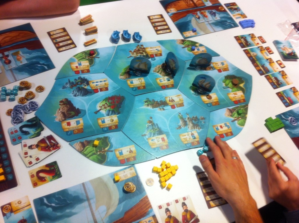 Islebound (2 à 4 joueurs) Un jeu financé via Kickstarter passé sous mes radars à ce moment là. Ryan Laukat est à la fois l’auteur, l’illustrateur (c’est magnifique) et l’éditeur, rien que ça. Nous somme à la tête de notre navire et naviguons d’ile en ile pour soit les conquérir soit simplement utiliser les ressources qu’elles proposent : recrutement de personnel, acquisition de ressources qui permettront de construire des bâtiments qui possèdent une capacité spéciale unique… Il y a beaucoup de possibilités de se développer en étant plus ou moins belliqueux avec les adversaires c’est selon nos goûts : conquérant, diplomate, commerçant,… La fin de la partie est déclenchée lorsqu’un joueur parvient à construire un nombre de bâtiments variable selon le nombre de joueurs. Le plus riche emportera alors la partie. La modularité du plateau ajoute encore de la rejouabilité s’il en était besoin.