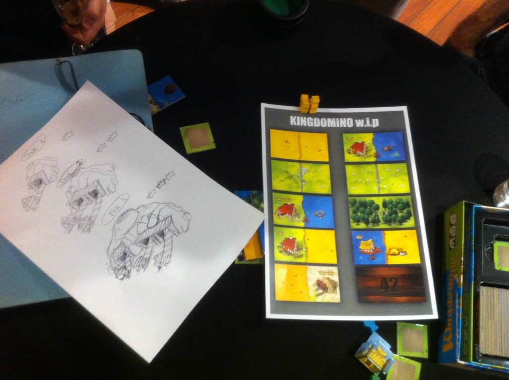 Photo prise lors de journées Blue Orange en mai, un chouette moment passé en compagnie de Cyril Bouquet l’illustrateur qui avait récemment repris le projet. La mécanique du jeu était terminée et il nous présentait quelques croquis de l’avancement de sa réflexion. Une chouette discussion autour des contraintes pour l’illustrateur, ses envies et les besoins de lisibilité et d’ergonomie du jeu mais aussi les délais à respecter pour être dans les temps d’impression pour Essen… Le mieux étant parfois l’ennemi du bien. Je vous laisse découvrir les différents Easter Eggs présents dans le jeu.