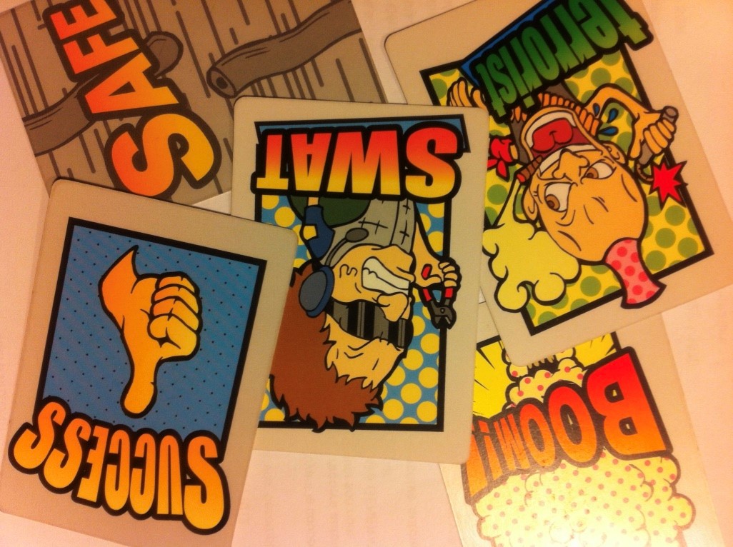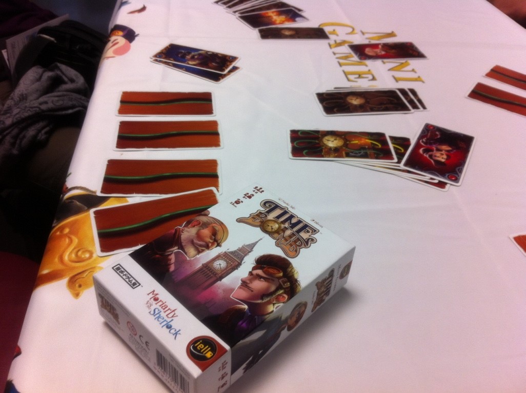 Time Bomb (4 à 8 joueurs) est un jeu à rôle secret très addictif. Les parties sont très courtes et se succèdent sans que l’on s’en rende compte : après l’avoir découvert avec le groupe de la Boîte à Chimère il y a quelques jours au CNJ lors des journées Iello j’ai rapporté mon édition japonaise à la BAC deux jours plus tard. Nous avons enchaîné 16 parties sans nous lasser. Les parties gagnent à s’enchaîner ainsi, les hésitations des joueurs étant influencées par les parties précédentes. La pince passe de main en main pour couper un fil (une carte) posé devant un autre joueur qui récupèrera la pince ensuite. Les forces de l’ordre tente de trouver les cartes succès (autant que de joueurs) tandis que les hors-la-loi vont essayer d’aller déclencher la bombe. Chacun y va de son baratin pour influer le choix de celui qui a la pince… Actualité oblige Iello a situé l’histoire dans l’opposition Holmes contre Moriarty. Les illustrations de Biboun sont superbes mais j’avoue avoir un faible pour l’édition originale japonaise (plus disponible et limitée à seulement 6 joueurs) qui opposait des terroristes à une équipe du SWAT. Je ne me prive pas de partager une photo avec vous.