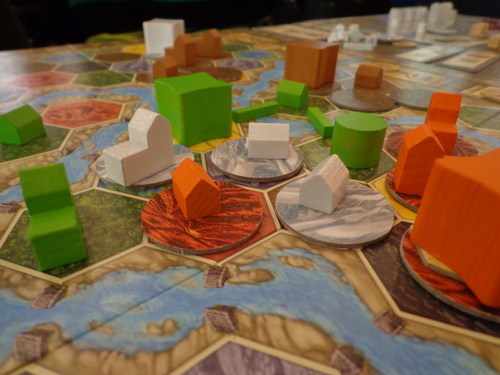 • Terra Mystica : contre toute attente car jeu sorti il y a quelques années ; je voudrai vraiment y rejouer régulièrement pour éviter d’oublier certaines choses qui me font perdre à chaque fois. Les bonus des batiments construits par exemple, j’ai fait 4 tours sans et je me demandais comment les autres arrivaient à se dépatouiller il me manquait toujours quelque chose lol Bref, il faut être vigilant à ce qu’on fait dans ce jeu. Ce n’est peut-être plus ma came, après tout. Avec des journées complètement dingues, on peut pas s’adonner à des pratiques intellectuelles violentes faut croire. Comme je disais, il faut que je prenne des congés pour voir remonter mes scores lol En tous les cas, Terra Mystica regroupe des ingrédients de placement et de gestion qui en font un jeu très riche en possibilités. C’est une merveille.