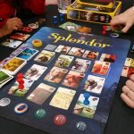 On a pu, juste après, jouer à une des extensions de Splendor ! Celle des pouvoirs ! On s’est régalé !!! Ca remet en cause un peu mais pas totalement votre stratégie, je dirai même que ça perturbe au début car j’ai BEAUCOUP joué à Splendor et j’ai une mécanique rodée, du coup ça dérange et c’est du très bon ! Car ça renouvelle énormément le jeu sans le dénaturer, mais ça le complique (en tous les cas cette extension). Donc je ne sais pas si tous les joueurs vont apprécier mais les gamers seront ravis. En effet, vos cartes posées serviront à activer des pouvoirs / objectifs / PV ; ces cartes spéciales à activer sont les mêmes pour tous.