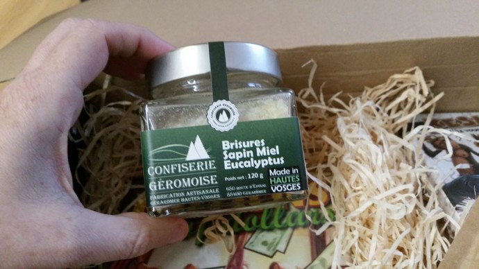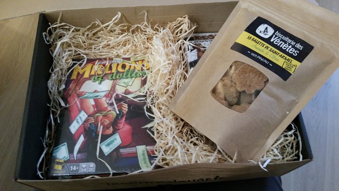 - le prix est de 35 euros (ou 32 si vous êtes abonnés à l’année via mondial relay). Les deux jeux de cette boîte font 12,90 et 10,50 euros (prix Philibert) (soit un total de 23,40 euros). Les gourmandises artisanales (biscuits et brisures de sapin) ainsi que les frais de port devraient donc couvrir près de 12 euros. On en a donc pour notre argent.