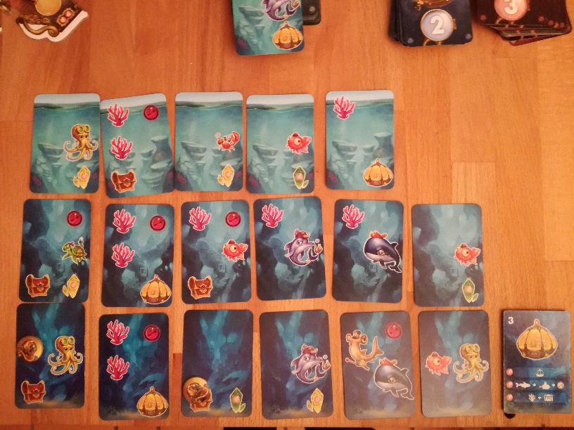 On va jouer 5 tours pour une manche et ensuite un décompte de points aura lieu. On passera ensuite à la manche suivante : une nouvelle ligne sera constituée sous la première, modélisant l’exploration dans des eaux un peu plus profondes. Un nouveau décompte aura lieu avant la 3ème et dernière manche. Le décompte de la dernière manche sera suivi d’un décompte final.