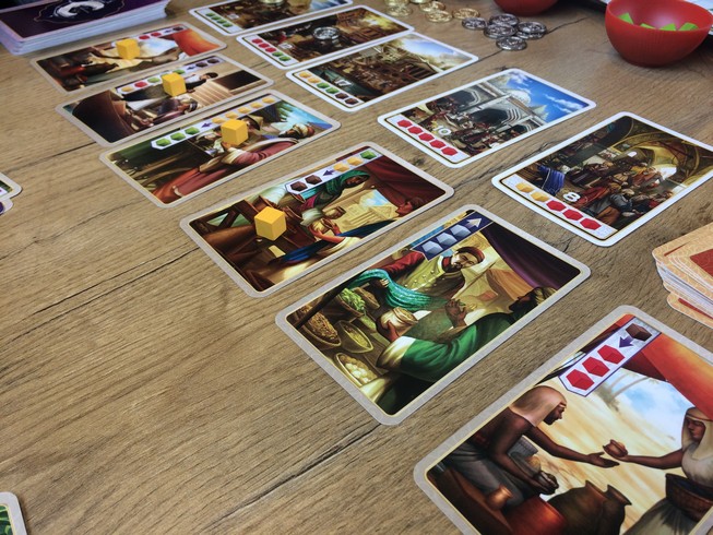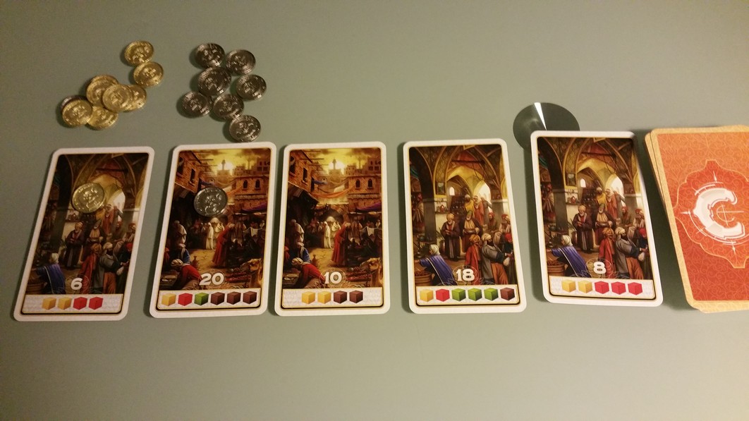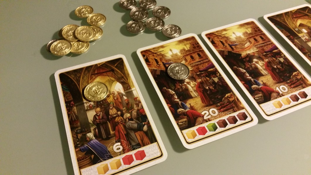 - Acheter/réclamer une carte pour la prendre dans votre main => plus elle se trouve à droite, plus elle vous coûtera ; la première sur la ligne sera gratuite, la seconde coûtera un épice (que vous poserez sur la carte précédente), la troisième coûtera 2 épices (que vous poserez sur les 2 cartes précédentes…) etc… et oui il est possible que la carte visée ait déjà des épices déposés par un autre joueur, et bien ils sont à vous si vous achetez la carte. A chaque fois qu’une carte est prise, on décale les cartes vers la gauche et on en pose une nouvelle pour le joueur d’après.