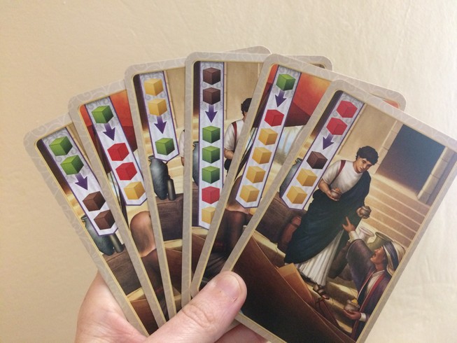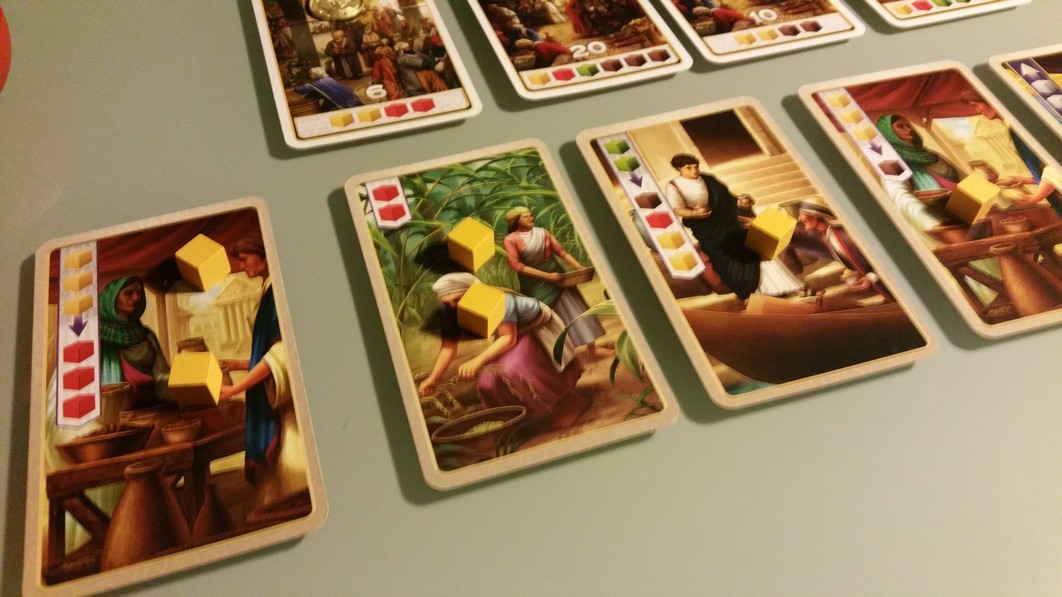 Pour être honnête, après 11 parties, on n’a jamais eu personne sans carte production supplémentaire donc déjà c’est un bon point (le hasard de la pioche a donc bien fait les choses). Mais quelle serait la différence entre un joueur qui produit de l’épice brun et un autre qui peut produire jusqu’à 8 jaunes ? Je ne me suis plus que ça attardé sur la question, parce que c’est pas forcément celui qui a le plus de cartes production qui remporte la partie mais plutôt celui qui a réussi à se faire un main de cartes qui se complètent parfaitement (prod, échange).