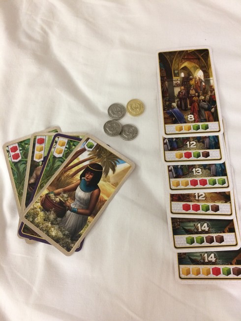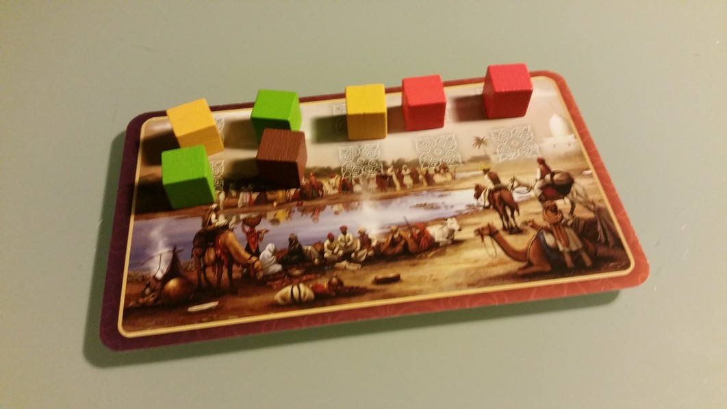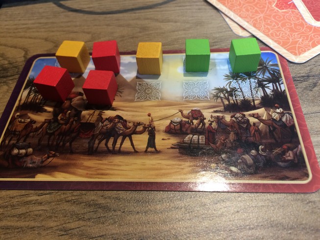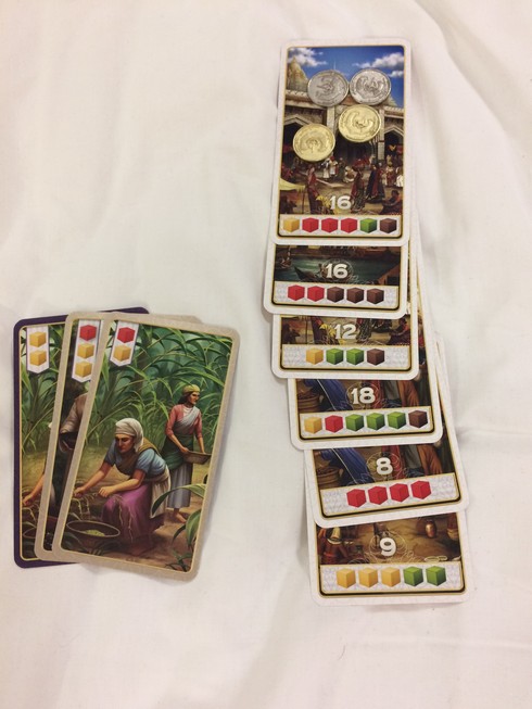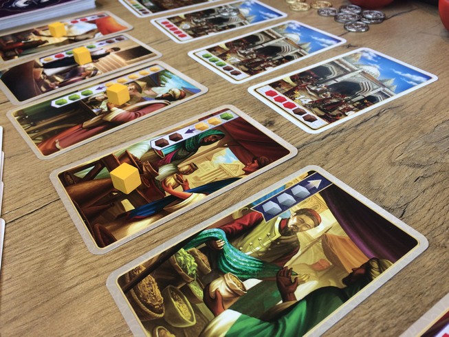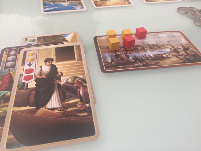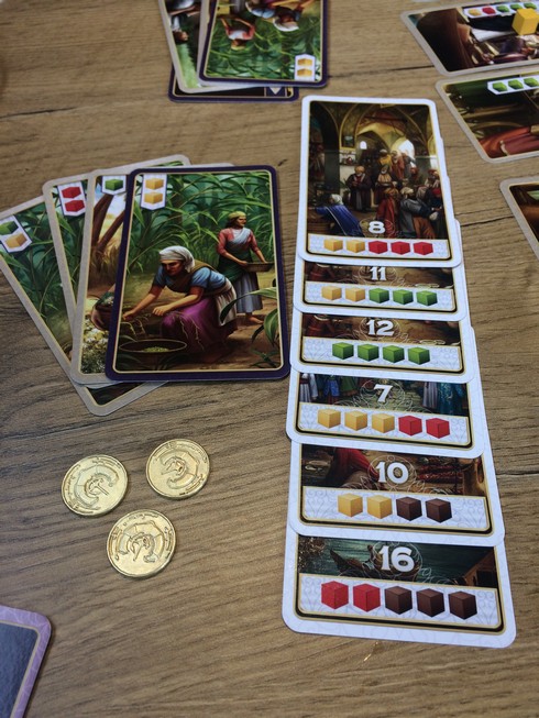 - Jouer une carte de sa main donc soit une carte production (qui vous permet de récupérer des épices depuis la réserve générale), soit une carte amélioration (pour améliorer vos épices) soit une carte échange (avec la réserve générale)