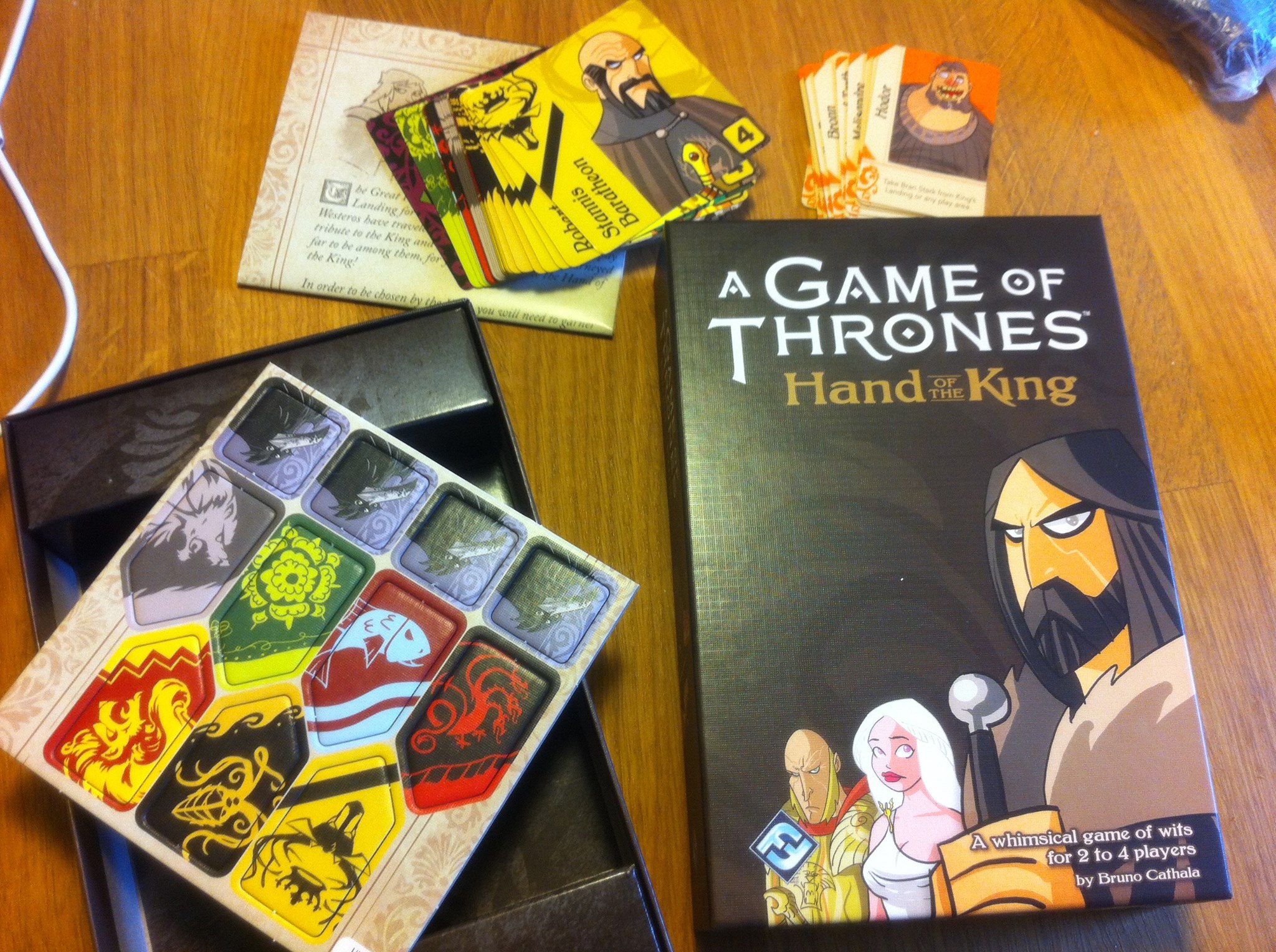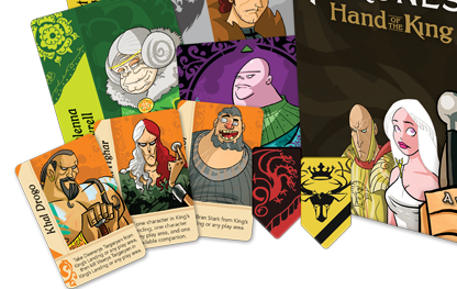 A Game of Thrones – Hand of the King est d’un tout autre registre que les deux précédents. Il s’agit d’un « petit jeu léger et taquin », comme l’a récemment rappelé son auteur, qui sortira en VF au printemps. Toutefois la VA (je dis Version Anglaise parce que VO pour un jeu en anglais d’un auteur français…. c’est pas logique) est déjà disponible et je m’y suis précipité après que Micha m’ait fait découvrir ce jeu. Parce que le jeu (bien sûr), les illustrations, le thème,…. l’humain craque… et joue, joue !