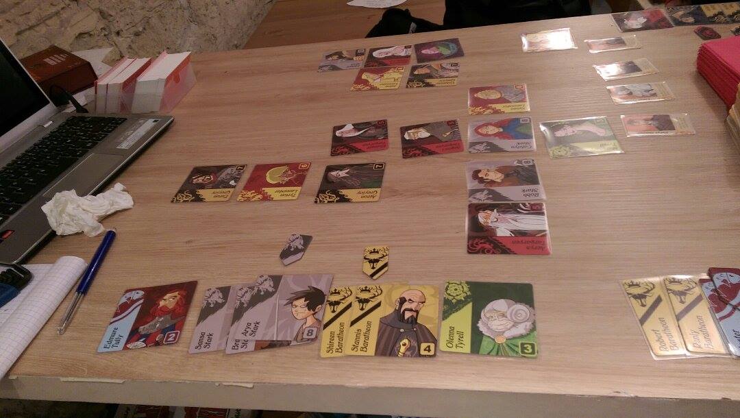 Le hasard de la mise en place et des compagnons tirés au sort pour la partie offre une grande variété d’ouvertures et de stratégies. C’est bon, c’est méchant parce que la thématique colle parfaitement au jeu (même aux compagnons qui peuvent se révéler si puissants). Le jeu est magnifiquement servi par les illustrations de Mihaljo Dimitrievski dont j’ai déjà apprécié le travail sur Pillards de la Mer du Nord (GGA 2016 dont les extensions sont actuellement proposées en campagne KS). On pourra reprocher un risque de kingmaking dans la version à 3 de ce jeu. Je l’ai vécue : situation avant le dernier coup : deux joueurs (dont moi) ont trois bannières, le troisième n’en a qu’une mais il doit jouer le dernier coup de la partie et peut encore choisir entre 2 personnages de familles différentes qui lui donneront l’un comme l’autre la majorité dans une famille et reprendre ainsi une bannière à l’un ou l’autre de ses adversaires… mais lequel ? Résultat final 3 /2 / 2. Reprocher du kingmaking à Game of Thrones, ce serait reprocher à un chat d’être un chat ? Non ? On a négocié, juré, râlé, « menacé », rigolé et on a rejoué pour se départager… On a passé un bon moment en fait. Je n’ai pas essayé la version à 4 joueurs (2vs2 sans communiquer, sauf avec la corneille).