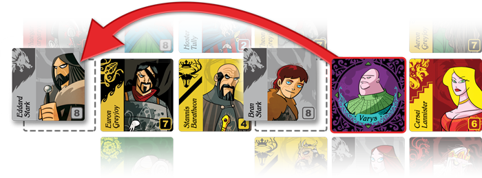 À votre tour de jeu vous devez « envoyer » (déplacer) Varys de sa nouvelle place vers un personnage que vous allez recruter le long d’une ligne ou d’une colonne. Vous recrutez ce personnage et vous placer Varys dans la grille à sa place Si dans son déplacement Varys croise un (des) membre(s) de la même famille que le personnage ciblé, vous les recrutez également. Avant de finir votre tour vous vérifiez si avec les personnages recrutés vous possédez autant ou plus de personnages de cette famille que quiconque. Si oui, vous prenez possession de la bannière de la famille. La partie prend fin lorsque Varys ne peut plus être déplacé. Le joueur possédant le plus de bannières l’emporte. En cas d’égalité, la victoire sera pour celui qui possède la bannière de la famille la plus nombreuse.