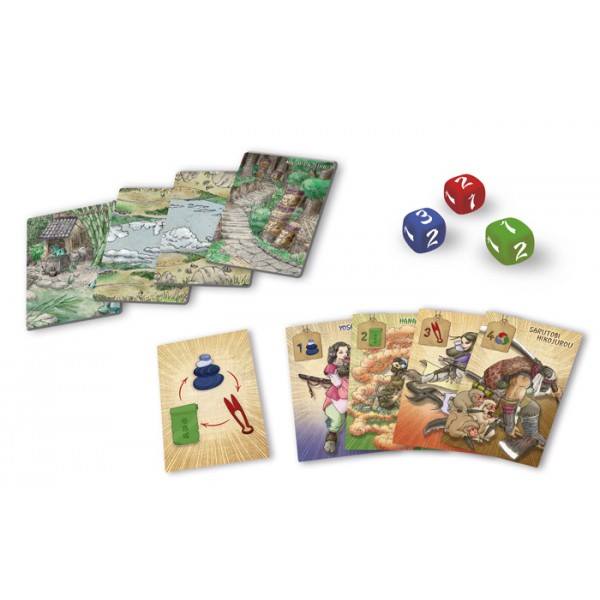 C’est encore une histoire de villages en conflit. 9 champs séparent ces deux villages. Chaque armée est composée de 1 chef + 9 Ninjas de type (pierre, feuille, ciseaux) et de force (1 à 3) différents. Elle va essayer d’aller prendre le contrôle du village adverse. Les déplacements des combattants sont gérés par 3 dés D3 de couleurs différentes (1 par type) que le joueur lance au début de son tour. Lorsque des ninjas adverses se rencontrent ils combattent « façon Chifoumi » (et vous êtes surpris si je vous dis que c’est grâce à Guillaume du même nom que j’ai appris que le jeu arrivait enfin ?). Si les combattants ont la même arme, c’est leur force qui les départage et en cas d’égalité chacun bat en retraite. Bref c’est simple, tactique, mâtiné d’un peu de hasard pour les déplacements avec les dés et belliqueux à souhait ! J’en avais gardé un excellent souvenir.