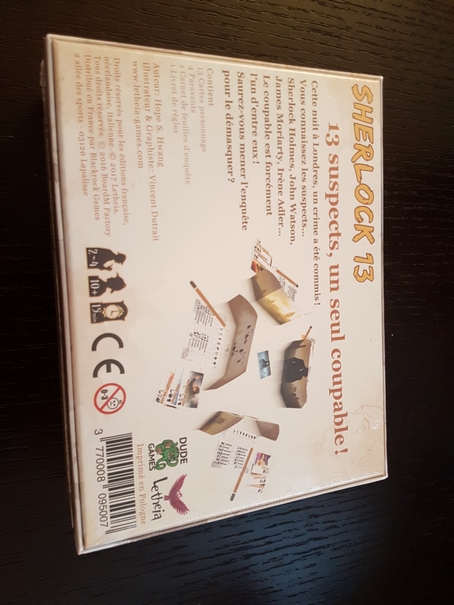 Sherlock 13 : Un jeu de Hope S. Hwang édité par Dude Games / 2 à 4 joueurs / 15 minutes / 10 ans et +. Je ne vais pas vous mentir, je ne sais pas grand-chose de ce jeu : Je n’y ai jamais joué. Mais Truffeauvent m’en a dit le plus grand bien et d’ailleurs elle a déjà dépassé les 50 parties ! Il s’agit d’un Cluedo like minimaliste où la déduction est totalement au cœur du jeu. J’ai très envie de m’y essayer !