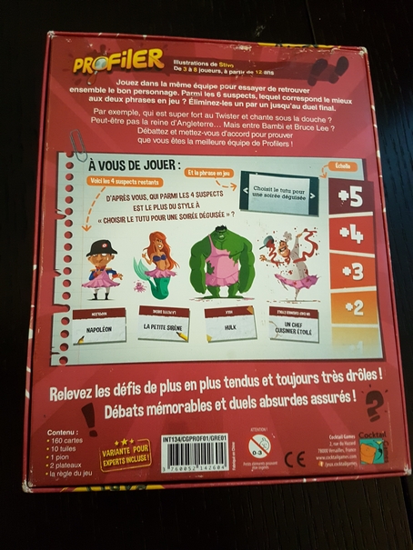 Profiler : Un jeu de Romaric Galonnier édité par Cocktail Games / 3 à 8 joueurs / 30 minutes / 12 ans et +. Autant vous le dire tout de suite, Profiler est MON GROS COUP DE CŒUR de ce premier semestre de l’année ! Rien que ça. Il faut dire que je ne l’avais pas vu venir. La boite du jeu ne m’avait pas tapé dans l’œil tout comme le résumé des règles. Pourtant, une fois en place, le jeu fonctionne bigrement bien ! Il s’agit d’un jeu de déduction / d’ambiance coopératif où les joueurs doivent identifier une personnalité parmi 5 autres avec seulement 2 critères et une échelle d’évaluation. Dit comme ça, ça vous parait bizarre ? Parfait ! Vous êtes dans le même état d’esprit que moi lorsque j’ai découvert le jeu. Idéal pour s’amuser à plusieurs entre adultes.