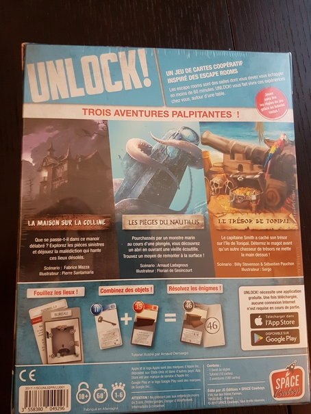 Unlock ! Mystery Adventure : Un jeu de Cyril Demaegd édité par les Space Cowboys / 1 à 6 joueurs / 60 minutes (ou moins, c’est mieux !) / 10 ans et +. J’avais déjà écrit un article pour dire tout le bien que je pensais de la 1ère boite d’Unlock ! Il s’agit d’un jeu proposant 3 scénarii simulant une escape room sous forme de cartes ! Très simple d’accès (d’autant qu’un mini paquet de cartes inclus dans la boite permet de faire une courte aventure vous évitant ainsi de lire les règles), Unlock ! peut s’avérer redoutable dans ses énigmes parfois grandement capilotractées mais toujours jouissives si l’on arrive à les surmonter ! D’autant que le jeu se joue avec une application gratuite qui vous donne des indices le cas échéant. Ma femme est accro à ce jeu est je pense que les 3 scénarii de la boite ne vont pas faire long feu.