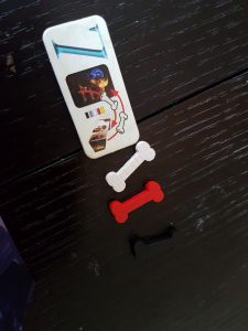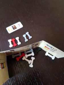 - Soit il ne pioche que des os qui ne sont pas noirs, il les place devant lui. Il a réussi son larcin ! Il peut alors tenter une gourmandise ! S’il ne le fait pas, le tour prend fin immédiatement pour l’ensemble des joueurs.
