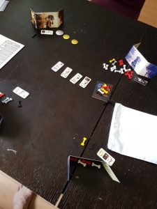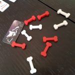 - Soit il pioche un os noir et il perd tous les os précédemment piochés pendant ce tour (sauf les Gris qu’il conserve, avec l’os noir, devant son paravent).