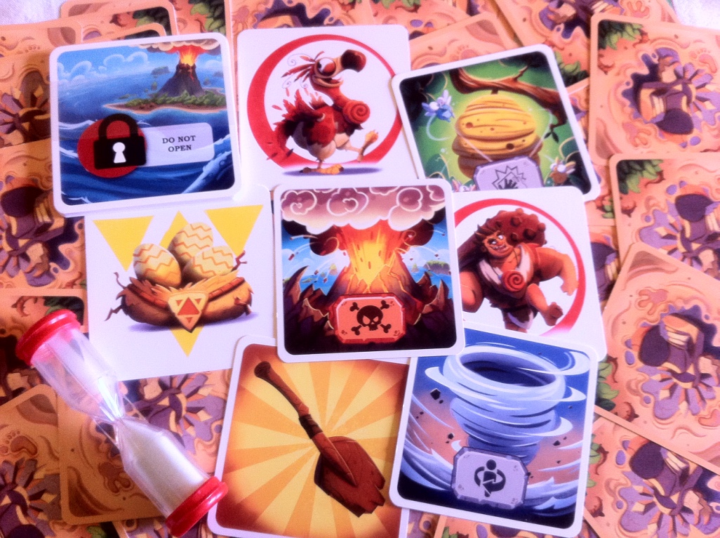 Panic Island, un jeu de Antonin Boccara, illustré par Michel Verdu et édité par Oldchap, qui se joue en 2mn (c’était pile dans le timing) ! Un coopératif (1 à 8 joueurs) sur une base de memory (à mémoire commune et informations partagées), mais pas que ça, qui nous amène sur une île du Pacifique (carré de 25 cartes aux très belles illustrations, faces cachées) dont le volcan va entrer en éruption dans 2 minutes et dont il faut sauver les 16 habitants (2 séries, une jaune, une rouge, de 2 Cro-Magnons, 3 Dodos et 3 Œufs) sans oublier de retrouver la rame et le radeau pour quitter l’île. Chacun son tour un joueur retourne 2 cartes face visible et peut soit récupérer la rame ou le radeau s’il les trouve soit sauver un habitant sur le principe de : si tu retournes un Cro-Magnon et un Dodo de la même couleur tu sauves le Dodo (enlèves la carte du plateau), si tu retournes un Dodo et un Œuf de la même couleur tu sauves l’Œuf,.. Mais attention à ne pas sauver tous les Dodos avant d’avoir sauvé les Œufs sinon ça va bloquer. Il restera la possibilité de faire appel au Dieu Bouga pour sauver encore plus de monde, mais ce n’est qu’une seule fois par manche et ce n’est pas plus simple. Les joueurs jouent ainsi à tour de rôle et peuvent communiquer sans retenue jusqu’à ce que le temps soit écoulé. Il sera alors temps de compter combien de survivants nous avons pu sauver.