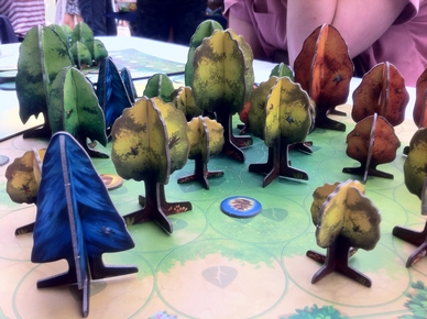 Les arbres, suivant leur croissance, ont une taille de 1, 2 ou 3 et vont générer autant de points de photosynthèse à chaque tour. Suivant sa taille, l’arbre projette aussi son ombre sur autant de cases dans la direction opposée au soleil. Les arbres qui se trouvent sur ces cases ombragées ne rapporteront pas de points d’actions s’ils ne sont pas plus grands que celui qui leur fait de l’ombre. Vous voyez là l’importance du placement de vos cultures et la nécessité de se projeter dans la rotation de l’astre solaire (oui, ici c’est bien le soleil qui tourne autour). Et pourquoi pas juste planter une graine pour empêcher l’autre de s’y mettre ? Blocage, ça aussi je l’ai dit !