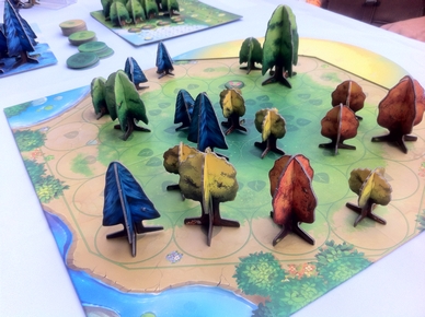 Lorsque vous coupez un arbre, vous gagnez immédiatement une tuile de 1 à 4 feuilles, suivant la place de l’arbre sur le plateau, qui vous rapportera de 13 à 22 points. Mais attention, prendre la place du centre, qui peut rapporter le plus de points sur un seul arbre, c’est aussi risquer d’avoir plus de mal à voir le soleil… à vous de choisir.