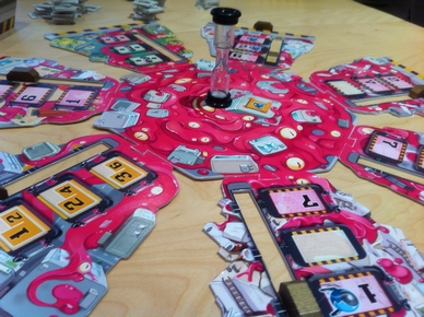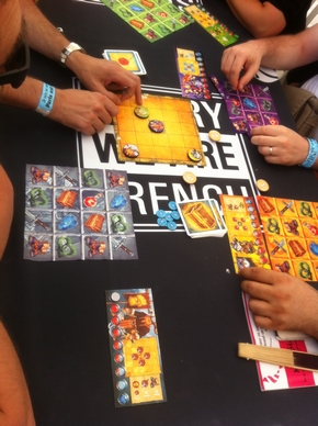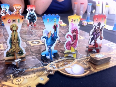 Dimanche matin, j’avais rendez-vous avec Fanny et son chéri. Et on attaque par une partie de Time Arena, déjà découvert au Festival Alchimie de Toulouse, mais là les visuels sont quasi définitifs (un joli travail de Shanshan Zhu) et j’ai vraiment adoré. Donc on y retourne ! Il s’agit du premier jeu de Fabrice Lamouille qui sortira très prochainement chez Blam Editions.