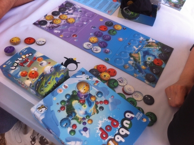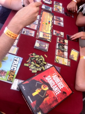 Enfin, l’heure était déjà au départ, mais en se rapprochant de la sortie nous passons devant Tom Vuarchex qui présente Twin It ! sur un « mange debout » (une petite table haute quoi) et il me faut faire une partie avant de partir.