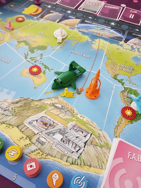 Matt Leacock (Le monsieur derrière Pandémie !), s’est chargé de l’adaptation des Thunderbirds en jeu de société à l’occasion des 50 ans de la série. Un Kickstarter a été réalisé et le projet a été financé à une vitesse supersonique. Suffisamment d’ailleurs pour débloquer de multiples extensions. Dans ThunderBirds, vous incarnez un membre de la famille Tracy chargé de contrecarrer les plans machiavéliques de l’infâme « The Hood » qui cherche à semer le chaos aux quatre coins du globe. Pour cela, vous bénéficiez notamment de véhicules aux spécificités propres. Le plateau de jeu représente le monde ainsi que l’île sur laquelle habitent les Tracy. C’est d’ici que partent la plupart des véhicules afin de parcourir le monde… ou même d’aller dans l’espace !
