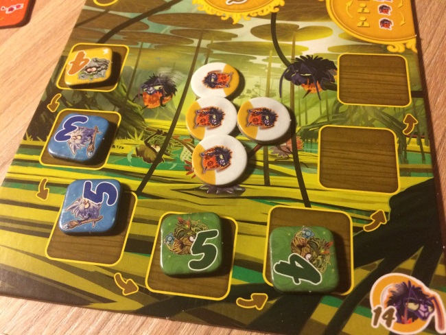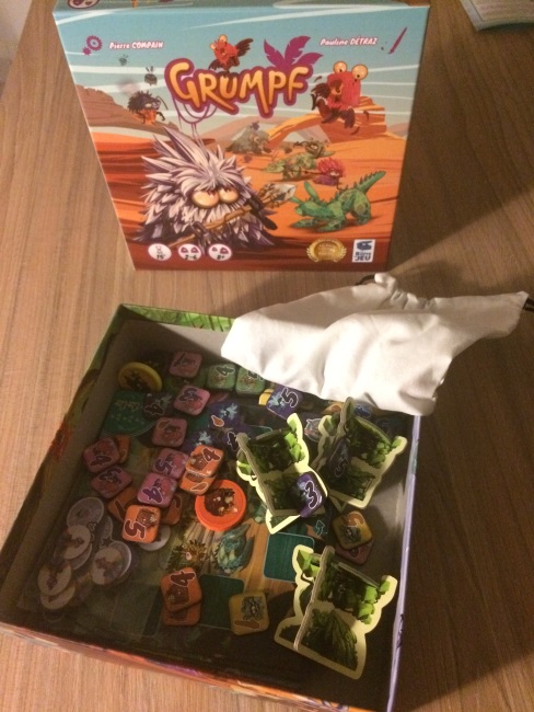 Dans Grumpf, les joueurs représentent une tribu qui chasse les animaux. La chasse se passe en temps réel (tout le monde joue en même temps, donc simultanément) sur des terrains qui accueillent des animaux plus ou moins nombreux et qui nécessitent des conditions (en force, en nombre…) pour que les chasseurs reviennent victorieux avec leurs butins. Au début des 4 tours, on va tirer 12 animaux au hasard et les mettre sur les terrains associés. Et simultanément on va mettre nos chasseurs (de force différentes ou bien force 0 mais qui assomme un autre chasseur lol) sur les terrains. La chasse se termine quand deux ou trois (selon le nombre de joueurs) joueurs ont terminé de poser leurs chasseurs et mis leur « totem » sur les cabanes. Quand un chasseur a terminé, il ne peut plus être assommé.