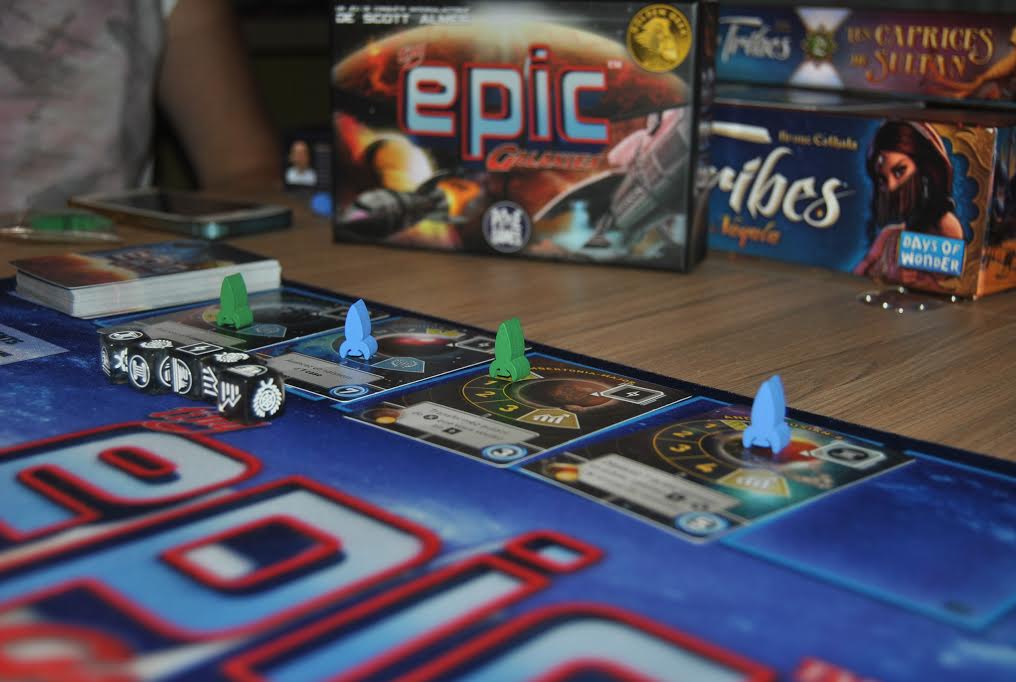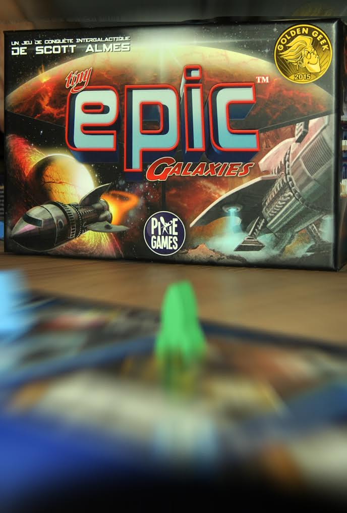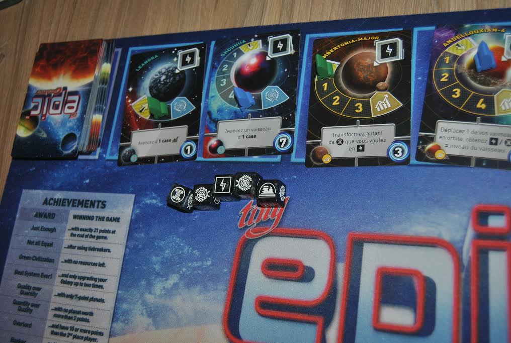 J’adore ce jeu. Je ne m’en lasse pas. Tiny Epic Galaxies est, en plus, sorti en VF cette année grâce à Pixie Games. Dans Tiny Epic Galaxies, vous essayez de coloniser des planètes et améliorez votre empire afin d’obtenir des points de victoire. Le 1er arrivé à 21, on finit le tour et on compte les points cachés (objectifs), celui ayant le plus de points remporte la victoire. Le tour de jeu est simple, vous lancez des dés (autant que ce que le niveau de votre empire vous permet) et vous jouez ces dés dans l’ordre souhaité :