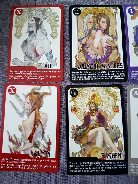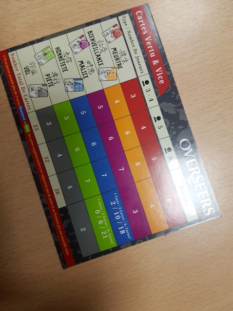 Overseers est un jeu de cartes basé sur le draft et le bluff se jouant en 3 manches. Au début de chaque manche, les joueurs ont 6 cartes en main. Il en existe 6 types différents : Meurtre (en rouge), Bienveillance (en Jaune), Malice (en violet), Honnêteté (en Bleu), Piété (en Vert) et Vol (en gris). Chaque type de cartes rapporte des points de victoire soit individuellement soit en série de 3. De plus, chaque joueur récupère une carte Personnage, face visible, qui lui donnera un avantage certain lors d’une phase définie de la manche. Un joueur incarne le leader et tranchera les éventuelles égalités.