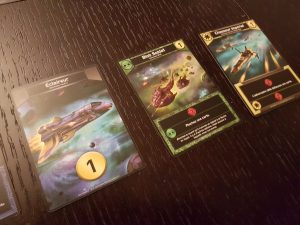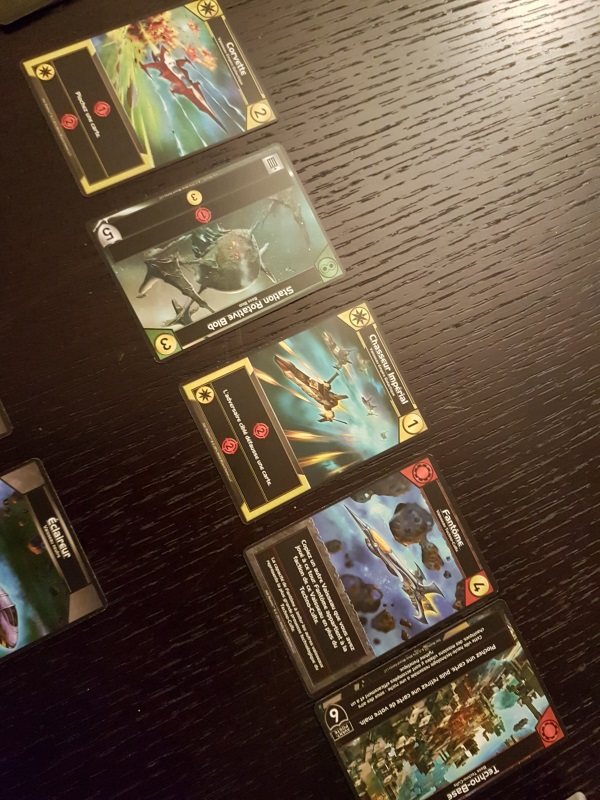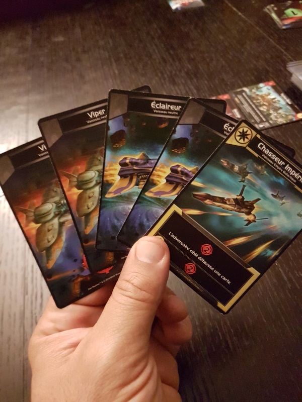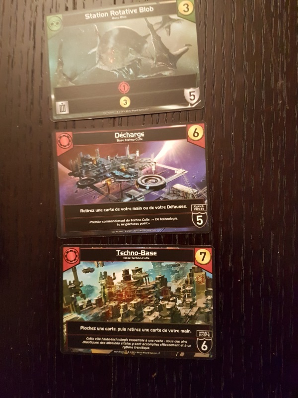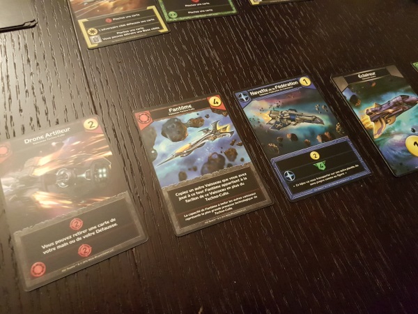 Les joueurs ont donc chacun des cartes en main et une pioche propre. Au centre de l’aire de jeu, se trouve la ligne d’achat où chacun pourra acheter de nouveaux vaisseaux ou de nouvelles bases. Il est également possible de se procurer des cartes Prospecteur. Lorsque l’on joue un vaisseau, il reste en jeu le temps du tour puis il retourne dans la défausse du joueur. Par contre, une base mise en jeu reste dans l’aire du joueur jusqu’à ce qu’elle soit détruite ou que ce dernier décide de la défausser pour activer un effet associé à cette situation. De plus, les bases peuvent servir d’avant poste et « encaisser » en premier les dégâts reçus.
