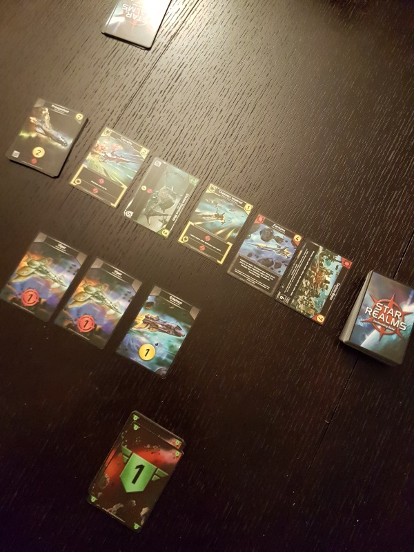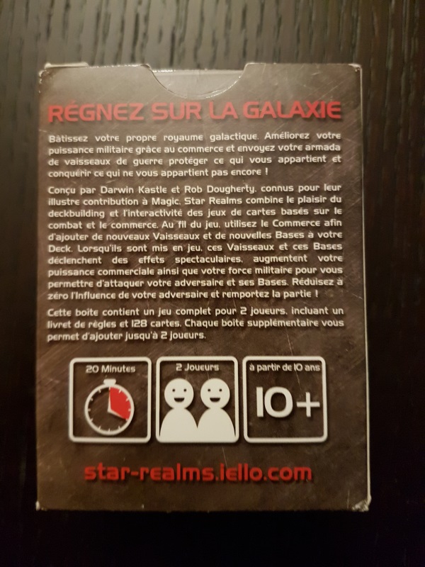 Il est des jeux dont on entend parler avec beaucoup de bien mais sur lesquels on n’a pas le temps de se pencher. Clairement, dans mon cas, Star Realms fût l’un de ceux-là. Il faut dire qu’il s’agit d’un jeu de « Deckbuilding » (C’est-à-dire de la construction et de l’optimisation d’une main de cartes) et que dans ce domaine, je ne jure que par l’excellent « Dominion » dont je ne compte plus le nombre de parties jouées. Mais devant la montagne d’avis positifs sur Star Realms, le joueur avisé que je suis n’a pas pu s’empêcher de mettre la main sur cette minuscule boite renfermant un jeu d’affrontement galactique.