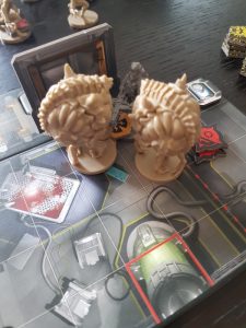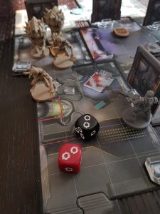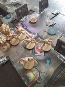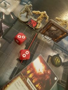A noter que, comme dans le jeu vidéo, il est possible d’éliminer un démon largement affaiblit simplement en lui marchand dessus (sans jet de dés donc). C’est le fameux « Glory Kill » de la version vidéoludique. Lorsqu’un Marins réalise une telle action, il pioche une carte spéciale qui lui donne des actions supplémentaires. Encore une fois, c’est simple mais terriblement en accord avec la licence.