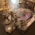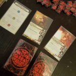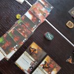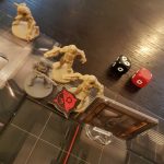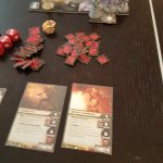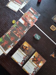 Le joueur incarnant l’ensemble des démons pourra, quant à lui, choisir quel groupe de bestioles il souhaite activer. Il aura même l’opportunité (en fonction du scénario sélectionné) de choisir entre 2 possibilités distinctes d’unités à mettre en jeu à des moments clés de la partie. Chaque combat est résolu très simplement : L’attaquant lance les dés de couleurs indiqués sur la carte qu’il a joué. Chaque impact présent sur les dés est une blessure. Le défenseur montre alors la 1ère carte de sa pioche et annonce le nombre de boucliers présents en haut à droite. Chaque bouclier annule un impact. Certaines cartes n’ont pas de bouclier, d’autre annule la totalité des blessures, d’autres, enfin, renvoient au type de créature attaquée pour savoir comment elle résiste.