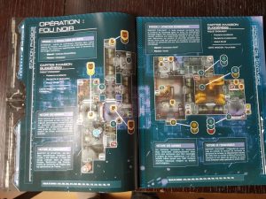 Est-ce encore utile de dire tout le bien que je pense de FFG / Edge concernant le matos de leurs jeux ? Doom ne déroge pas à la règle : des figurines magnifiquement sculptées et parfaitement en accord avec le jeu vidéo éponyme, des jetons en pagaille, des cartes illustrées avec des photos « in game » et de quoi créer des aires de jeux plus ou moins vastes. Un vrai régal. Cette très bonne 1ère impression se confirme lorsque l’on jette un œil dans les 3 livrets présents dans la boite. Le livret d’apprentissage, particulièrement clair dans sa mise en page et ses explications, présente un scénario permettant d’apprendre très simplement 80% des règles. Ensuite, le Guide des opérations retrace 2 Opérations divisées chacune en 6 missions se suivant logiquement. Enfin, si vous avez la moindre interrogation en cours de partie, le Guide de Référence reprend et développe chaque point de règles. Il y a donc de la lecture de règles, certes, mais celle-ci est limpide.