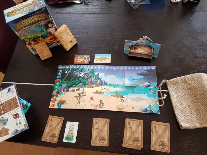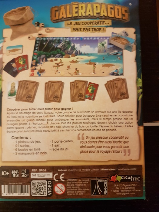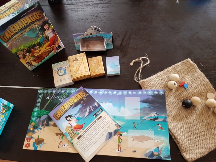 Dans Galérapagos, 3 à 12 joueurs incarnent des naufragés échoués sur une île déserte. Une tempête dévastatrice approche et tous ont très peu de temps pour construire un radeau suffisamment spacieux pour accueillir tous les protagonistes et quitter les lieux avec des vivres. Seulement voilà, il faut en parallèle récolter de la nourriture, de l’eau et éventuellement fouiller l’épave du défunt navire. Comme cela est très justement écrit sur la boite, il s’agit ici d’un jeu « coopératif… mais pas trop ! ».