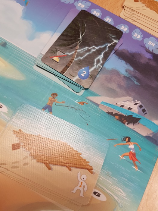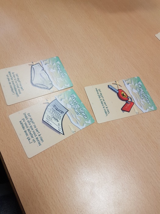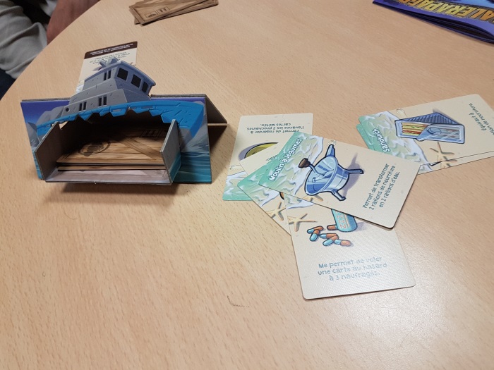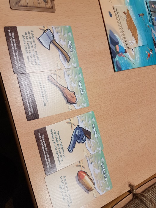 - Fouiller l’épave : De loin l’action la plus individualiste proposée par le jeu : Le joueur prend la première carte de la pile d’objets et l’ajoute à sa main sans la montrer. Celle-ci peut être utile au groupe : Des rations de nourriture, d’eau, améliorer la collecte de l’eau ou la pêche… Mais, le bateau échoué renferme aussi pas mal d’objets fourbes, à commencer par des armes à feu, des balles et, pourquoi pas, un kit de barbecue pour manger vos compagnons d’infortune ! Il est également possible de piocher des objets parfaitement inutiles !