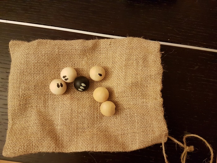 - Aller pêcher : Dans ce cas, le joueur pioche au hasard une boule dans le sac. Il en tirera 1, 2 ou 3 poissons symbolisant autant de nourritures pour le groupe.