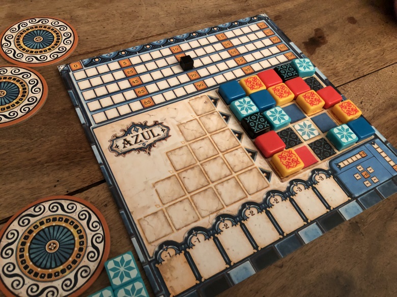 On y a joué le premier soir (je crois ou le second? je m’y perds dans les soirées…). J’ai été complètement sous le charme visuel et mécanique de ce jeu. Tout est parfaitement placé dans la mécanique, rien ne dépasse, rien n’est trop ça ou pas assez ceci. Il tourne aussi bien qu’un moteur de T MAX. Bref, Azul c’est Sagrada pour gamer. Déjà j’aime Sagrada, je ne pouvais donc qu’être conquise. Donc Azul ? Rapidement, la mécanique consiste, à votre tour, à choisir une face de tuile, à récupérer toutes ces tuiles sur un marché ou bien sur la défausse et à placer ces tuiles sur la même ligne de votre plateau. Une fois que les tuiles ont toutes été récupérées on fait glisser une tuile par ligne complète sur notre mur, on marque des points selon les tuiles adjacentes. J’abrège volontairement, les règles sont disponibles en français sur BGG je vous invite à les télécharger si vous ne connaissez pas.