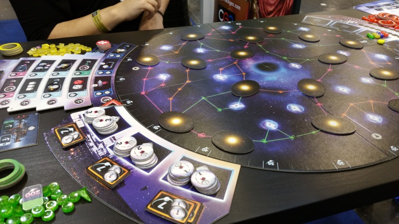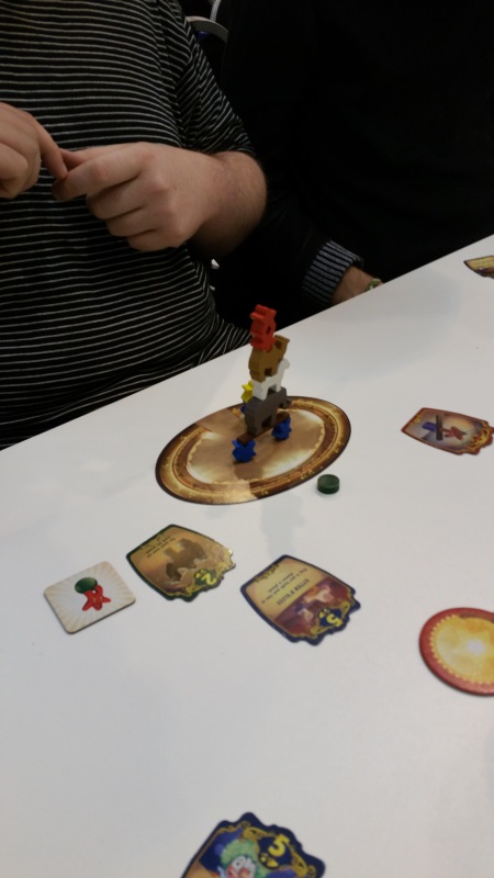 Je n’ai pris qu’une seule photo, probablement parce que j’étais très prise dans le jeu. Et bizarrement je ne l’ai pas acheté. Tout simplement parce que c’est une usine à points. Certes très attractive, mais je me disais, qu’au bout de deux parties, j’en aurai fait le tour. J’y ai pensé pendant 4 jours, quand même, à ce jeu mais déjà je ne peux pas le sortir avec mon groupe de joueurs actuel et en plus je ne sais pas s’il aurait eu une longue vie. Donc je suis repartie sans…