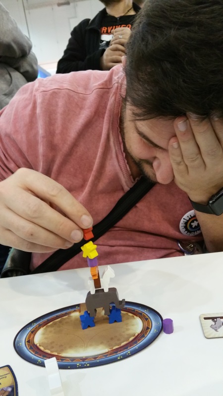 Je crois que Meeple Circus peut vite monter à la tête… faites attention. Car vous avez deux manches avec jeu simultané, et une manche où tout le monde vous regarde faire le spectacle de meeples et autres formes en bois. La dernière manche est particulièrement marrante, mais surtout le plus difficile. Quand Lionel vise à côté car il ne peut monter son spectacle qu’avec un oeil, c’est forcément marrant. Quand je me concentre sur le spectacle plutôt que ma contrainte (parler et expliquer mon spectacle), Fanny me le fait bien comprendre et je perds tous mes moyens jusqu’à lui hurler dessus tellement je rigolais intérieurement car ma moitié me dit toujours que je ne sais pas faire deux choses en même temps. Ouai monter un spectacle avec dextérité et parler en même temps, ça n’a pas marché lol