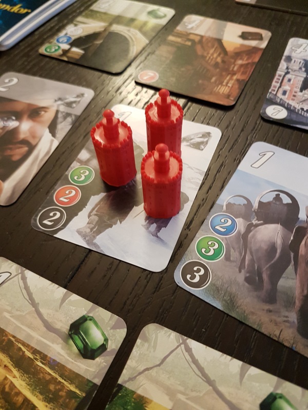 En plus de la mise en place habituelle de Splendor, les joueurs s’emparent chacun de 3 bastions en plastique à leur couleur. Chaque fois qu’un joueur achète une carte, il doit :