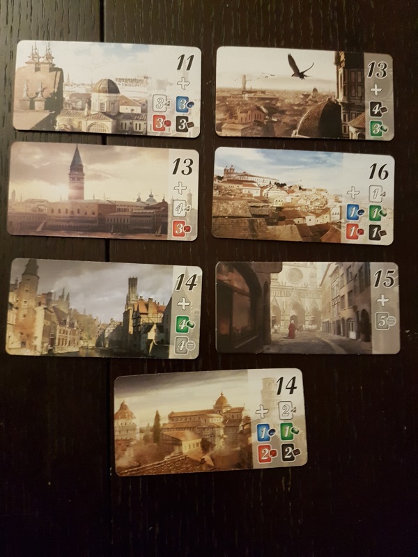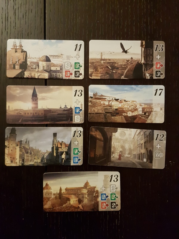 Pour remporter l’une des tuiles « Cités », vous devez avoir au préalable cumulé un certain nombre de points de victoire (PV) ainsi qu’une combinaison de cartes imposées. Par exemple, une tuile « Cités » vous demandera d’avoir un score au moins égal à 13 PV et de posséder dans votre jeu 4 cartes rouges et 3 noires. Si un seul joueur remporte une tuile « Cité », on termine le tour et il remporte la partie. Si d’autres joueurs remportent des tuiles « Cité » lors de ce même tour, c’est celui avec le score le plus élevé qui l’emporte. Cette extension peut donc faire gagner un joueur qui, dans l’absolu, n’a pas le maximum de points de victoire mais a su remporter une tuile « Cité » au bon moment.