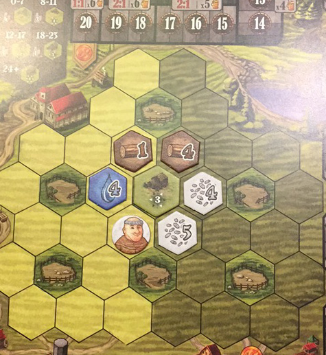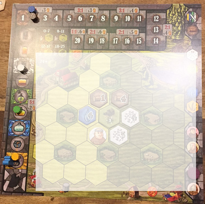Sur l’exemple ci-dessus, le bois de valeur 4 est dans la partie ombragée de mon champs, donc il a fallu que je paye 4 pour le placer et le revenu de celui-ci sera de 4 Ducats, idem pour les levures de valeur 4 et 5.