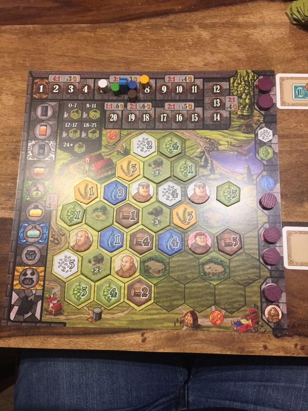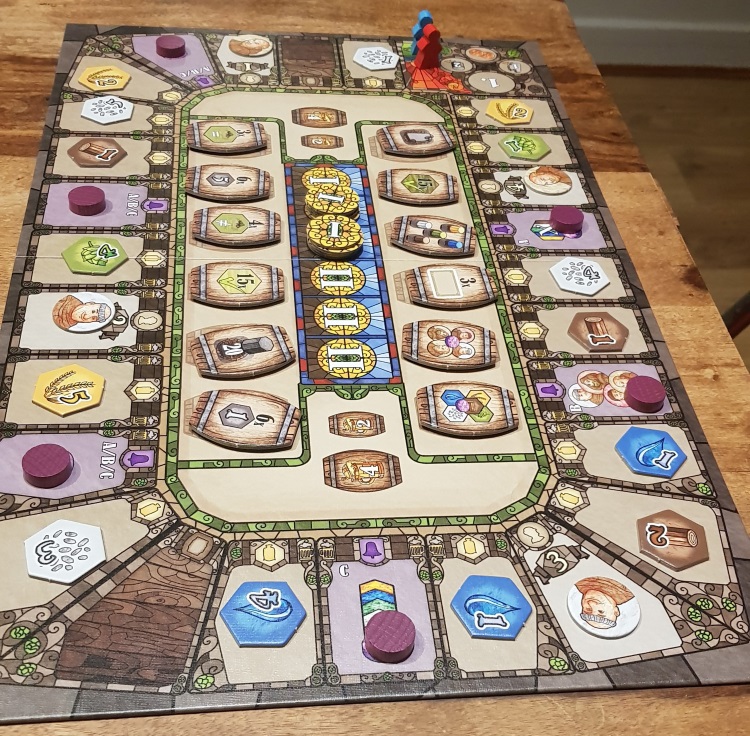 Sur celui-ci, sur le pourtour, se trouvent les différentes ressources du jeu (eau, bois, Houblon, Orge et Levure), les moines, les cases qui permettent de réaliser des objectifs, ainsi que des cases d’activation de bonus.